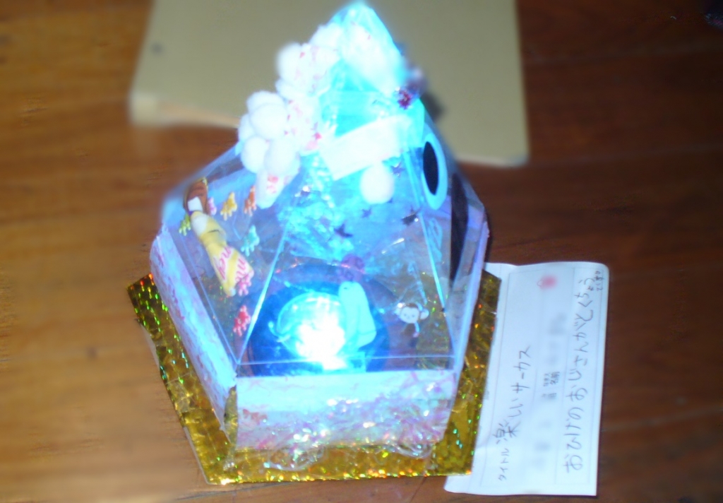 この工作は外側が透明のプラスチック板で、飾りをつけることができるうえ、下の方からLED照明を当てることで、光の面白さも感じさせる楽しい工作です。