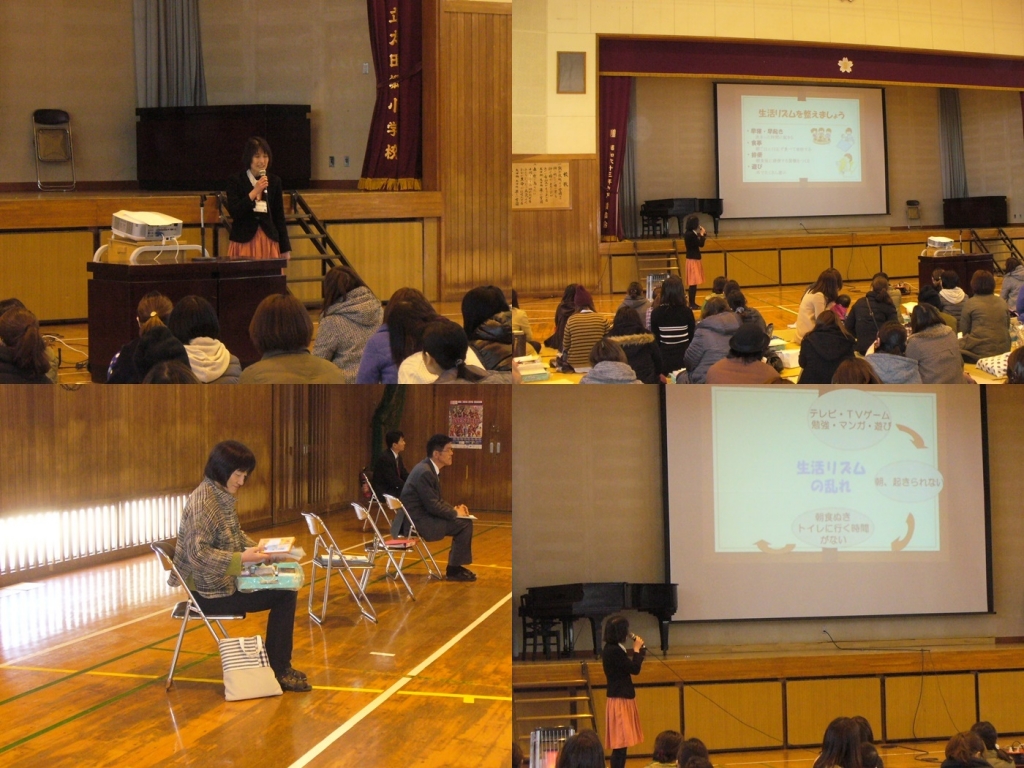 校長先生のお話に続いて、本校の保健室の先生(養護教諭)からの健康と生活リズムについてのお話がありました。