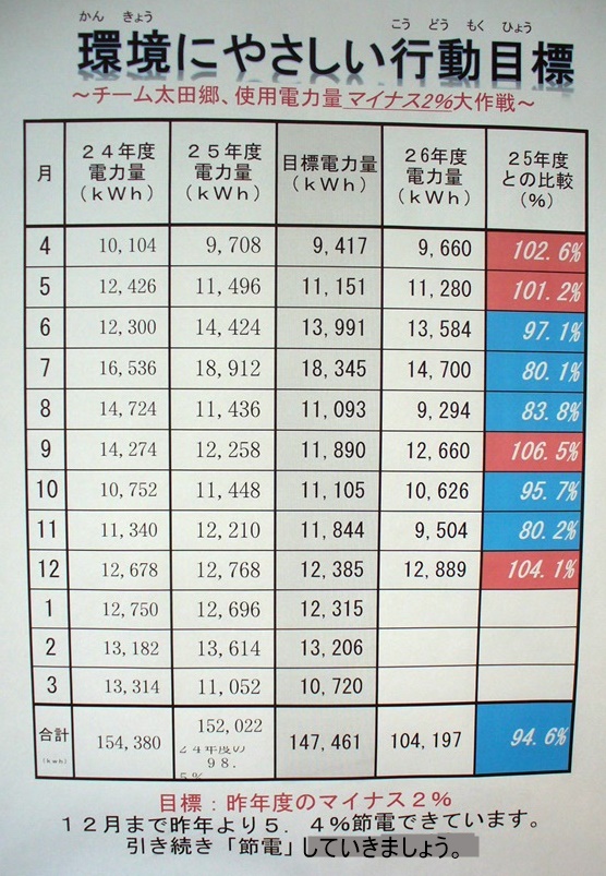 下の表は、この3年間の使用電力量を一覧表にしたものです。児童数や毎年使う教室数が少しずつ違うので一概には言えませんが、年々節電の意識が先生方にも子どもたちにも高まっているように思えます。