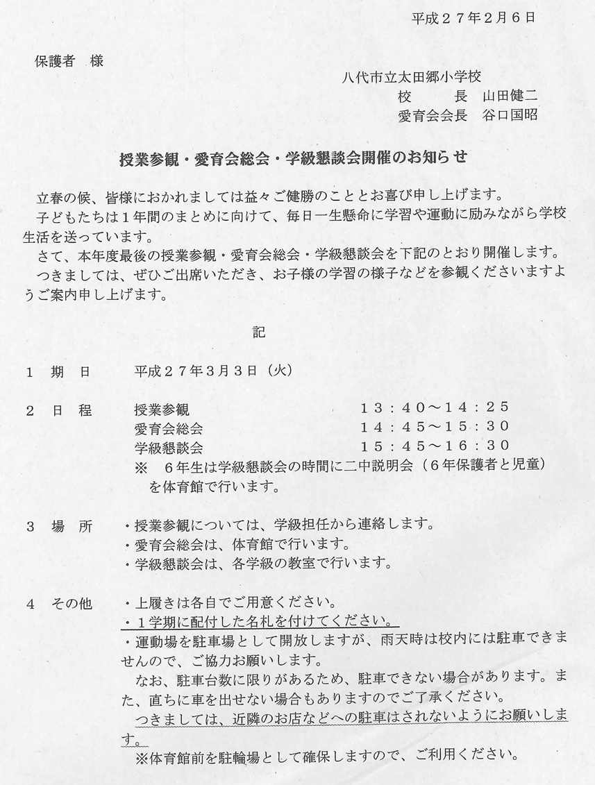 なお、6年生は4月から中学生になります。第二中学校の説明会が学級懇談会の時間に体育館で行われます。