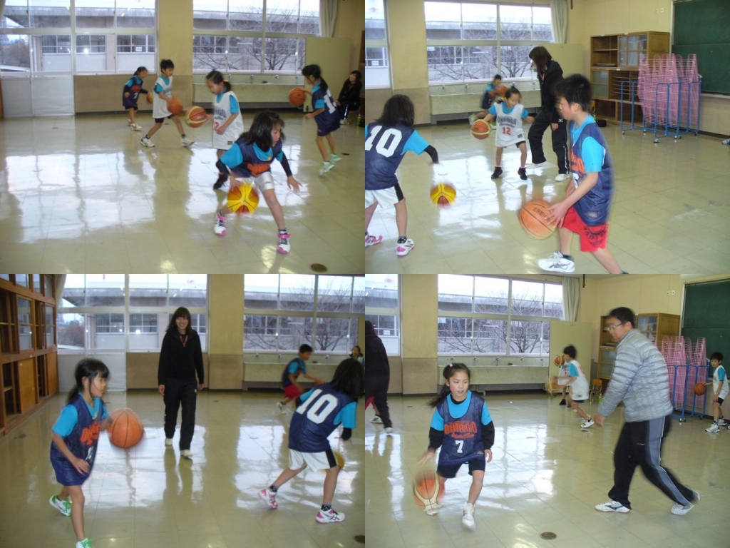 下は3年生のキッズバスケットの練習のようすです。いつも元気のいい声が校舎内に響いています。(※体育館の部活動の割り振りの関係で昨日は図工室を使って練習しました。)
