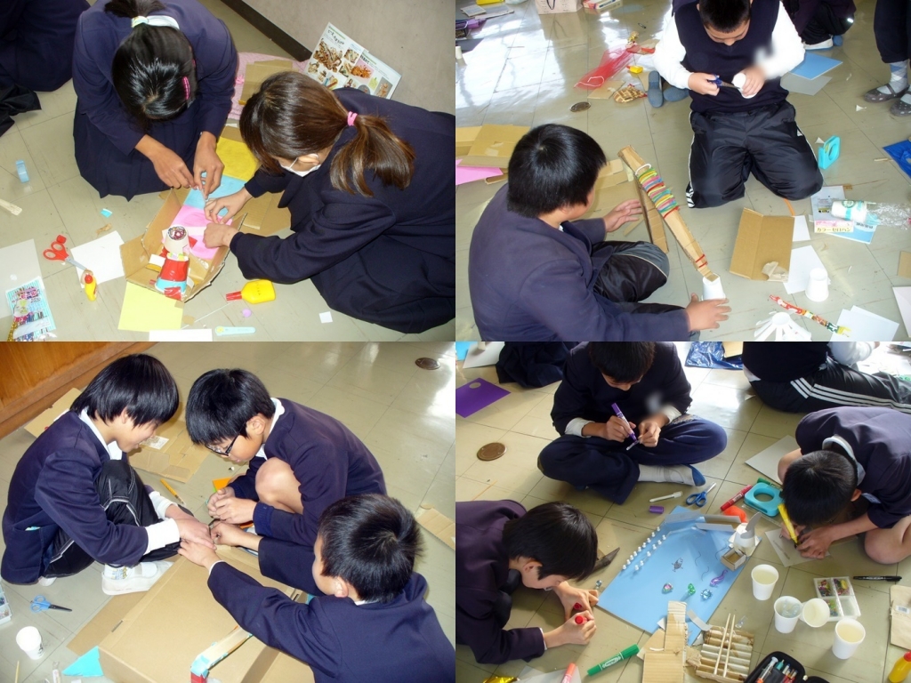 図工室をのぞいてきました。チームを作ってわいわい言いながら面白い物を作っていましたよ。