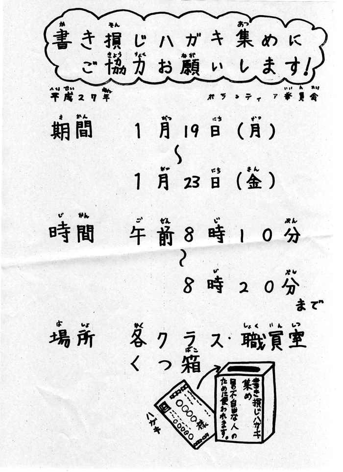 そして、みなさんにお願いがあります。もちろん当選しなかったものでいいのですが、「書き間違えたはがき」があると思います。(年賀はがきだけでなく通常のはがきもOKです。)それを、本校のボランティア委員会が今週一週間学校で集めます。集めたはがきは、外国や日本の困っている子どもたちを支援する団体へ寄付します。皆さんの善意が本当に大きな力になります。1枚でも結構です。ぜひお子さんに持たせてください。