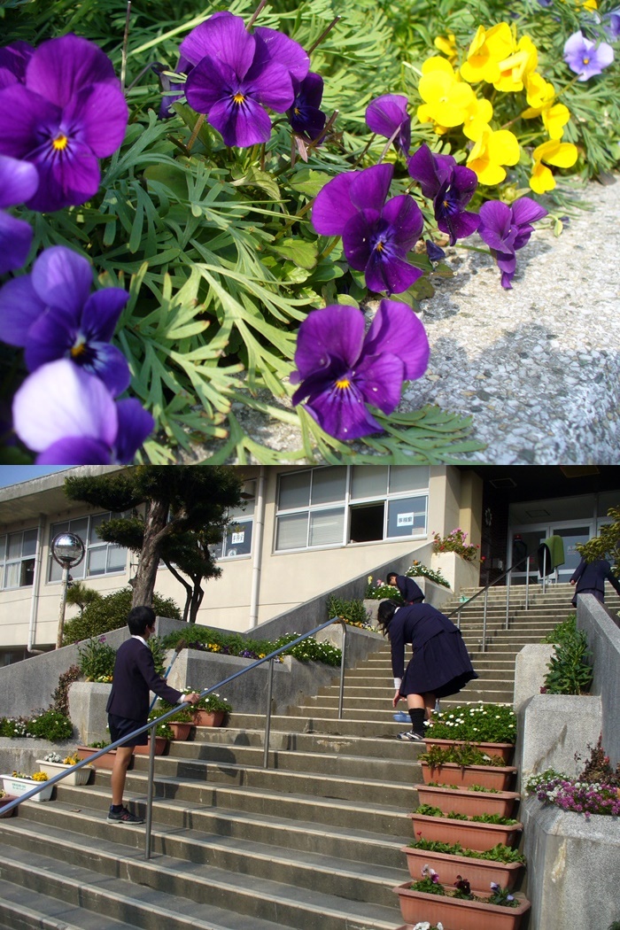 【上は、玄関のプランターに咲いているパンジーです。下はその玄関を掃除している6年生です。】