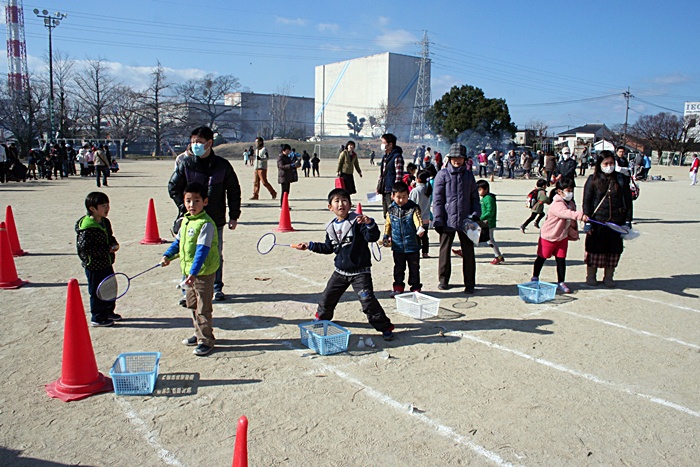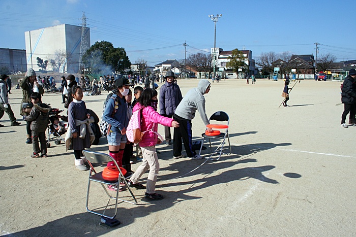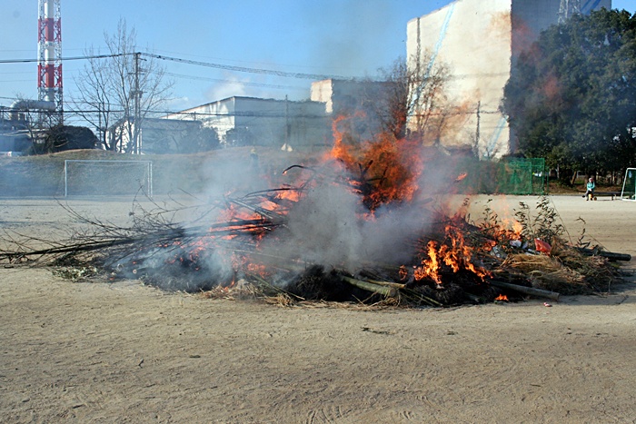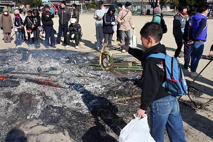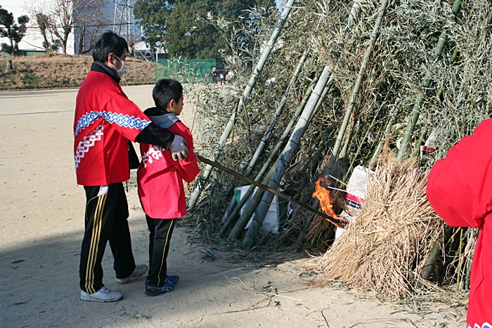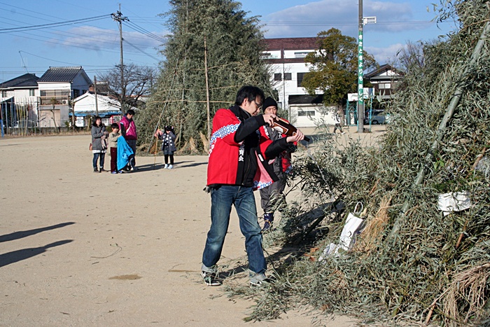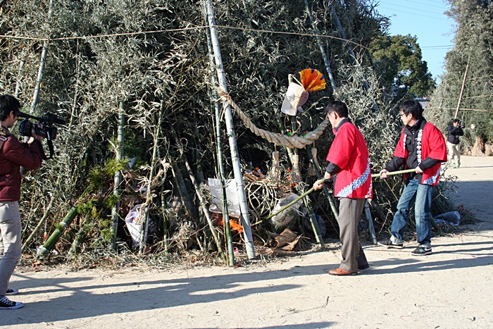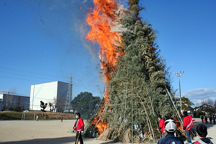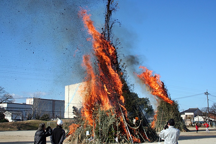 1月14日の夜または1月15日の朝に、刈り取り跡の残る田などに長い竹を3、4本組んで立て、そこにその年飾った門松やしめ縄飾り、書き初めで書いた物を持ち寄って焼く行事です。