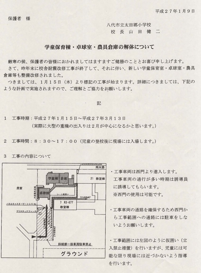 明日より、学童保育等の解体が始まります。工事車両の出入りがあります。車でのお子さんの送迎については、駐車でないスペースがありますので、もう一度プリントを読んでいただき、ご協力をお願いいたします。