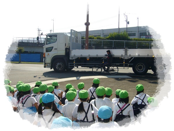 これも2年生です。校区内の自動車学校に行きました。交通ルールのことや事故の危険について学びました。