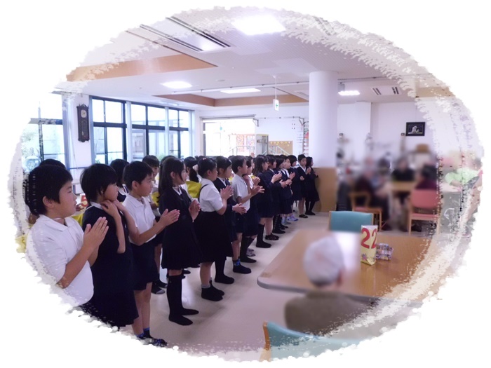 例年3年生は、総合的な学習の時間の勉強で近くの特別養護老人ホームへ行ってお年寄りと交流しています。
