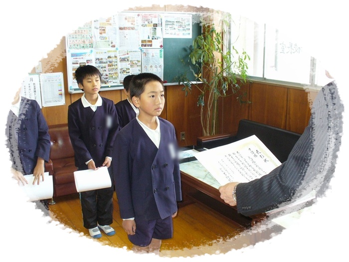 部活動の大会などでたくさんの賞をもらってきました。終業式で紹介し、校長室で表彰をしていただきました。