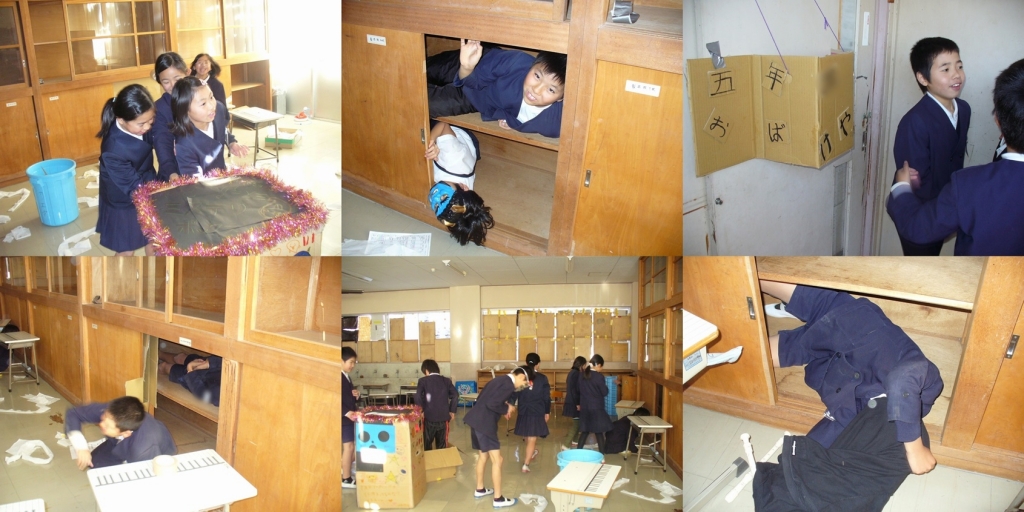 図工室に紙を貼って少しでも暗くしたつもりですが、残念(>o<;)、今日は天気がよくあまり暗くなりません。しかも、仕掛けは、棚の中に入っておどかすと言う何ともシンプルなもので、( これで驚くとは思えないけどなあ・・・。)というわたしの懸念はどこへやら、結構「キャー」という声が響いていました。!(・○・)!
