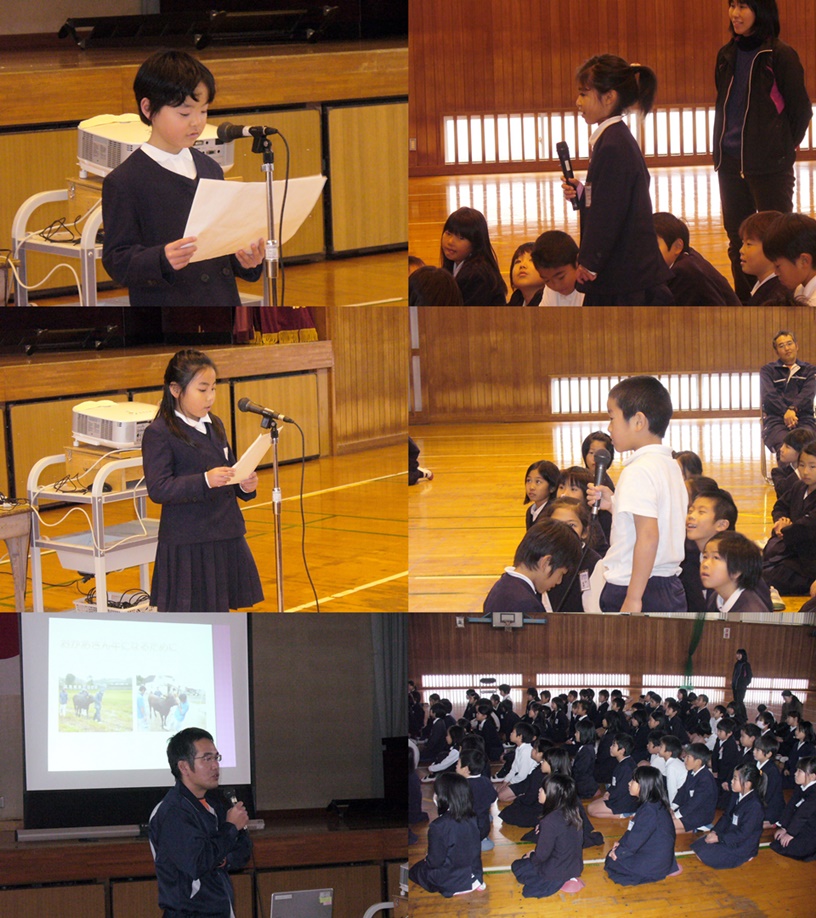 代表の人からは、お父さんが遠く離れてお仕事をしているのでなかなか会えなくてさみしいことや、体の不自由なお年寄りのお世話をしているお母さんのこと、食べ物を調理する仕事をしているお母さんのお仕事のことなどが紹介されました。