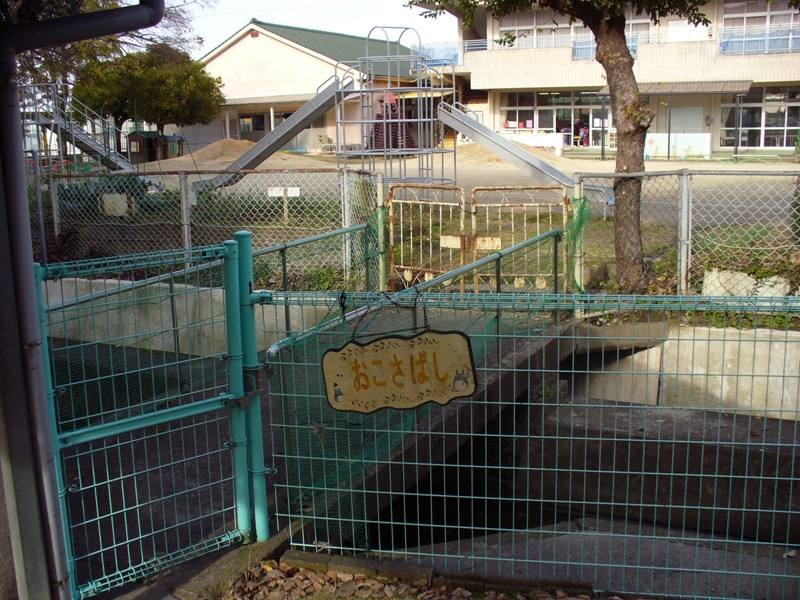幼稚園の皆さんが、避難訓練の時にわたってきたのがこの「おこさ橋」です。太田郷小学校と太田郷幼稚園の間にある用水路にかかっています。