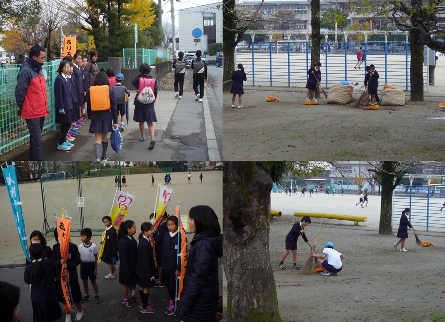 ボランティア委員会の子どもたちが運動場の周りの落ち葉を一生懸命掃き集めていました。