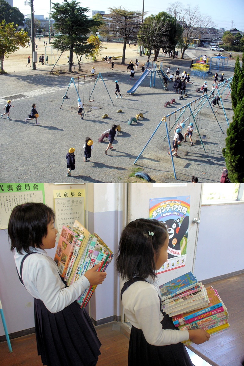 写真下段は、2年生の女の子たちが図書室から借りた学級文庫用の本をクラスに運ぶところです。とてもたくさんの本ですね。「重くない?」と聞くと「だいじょうぶです!」と元気にお返事をしてくれました。2年生はとてもはきはきお返事のできる学年です。