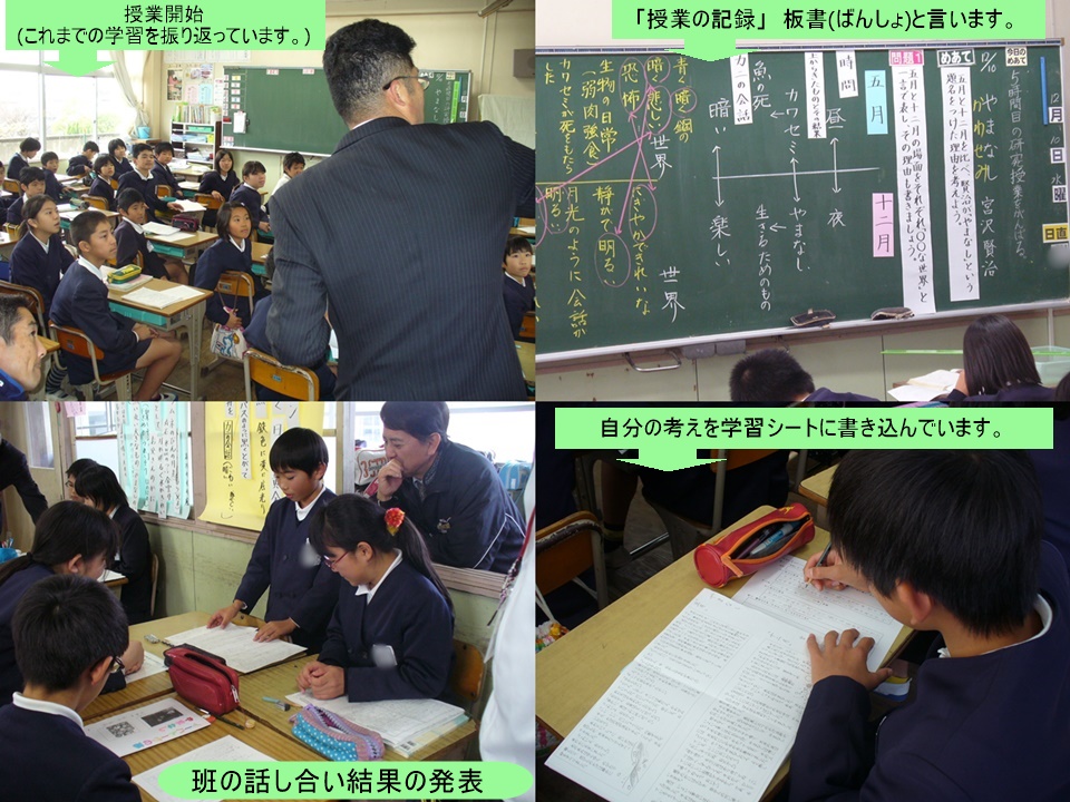 高学年部会は6年生の国語「やまなし」の授業でした。宮沢賢治の有名な童話です。今日のめあては「五月と十二月の場面を比べ、賢治が「やまなし」という題名をつけた理由を考えよう』というものでした。どういうことかな??という感じですよね。( ^∀^ ) 小学校六年生でなかなかレベルの高い課題です。