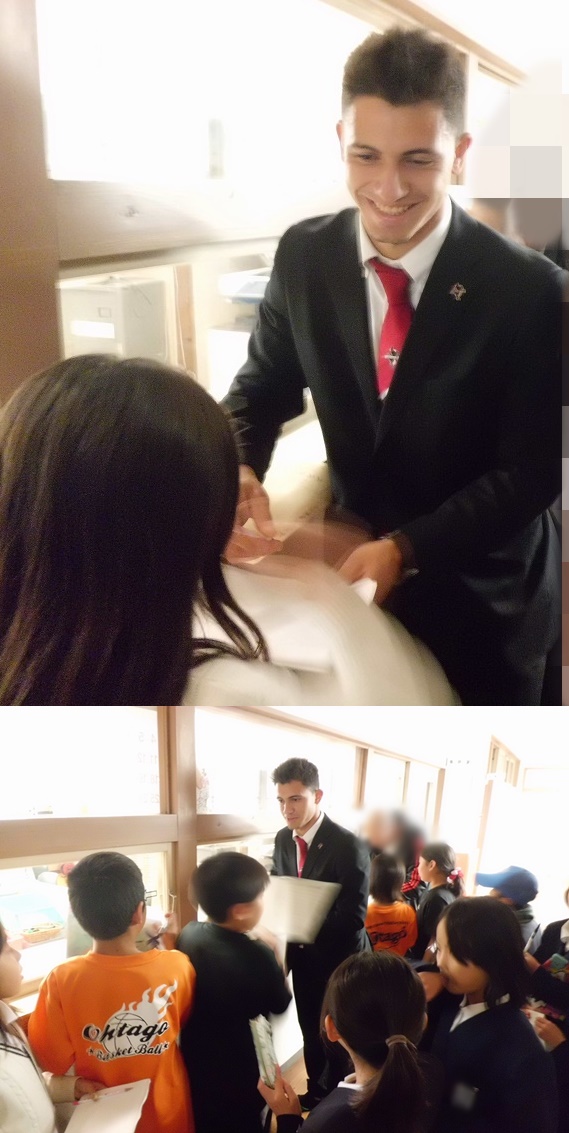写真でお分かりのようにかっこいいですね。((´∀`)) 女の子たちはもちろん、男の子たちもサインを書いてもらおうとちょっとしたパニックになりました。(あまりにたくさんの子どもたちがいたので、迷惑になるといけないと思い、「みんな、パブロ選手はいそがしいんだよ。代わりに先生のサインじゃダメ?」というと、あっさり、「ダメ! (乂`ェ´*)」と言われました。まあ、そりゃそうだね。)