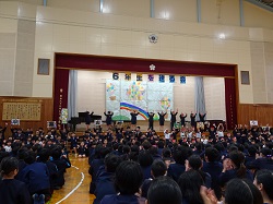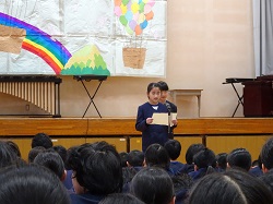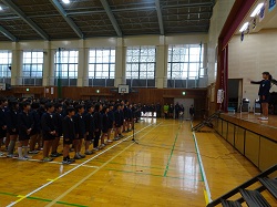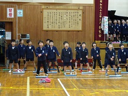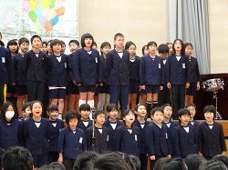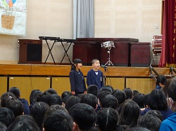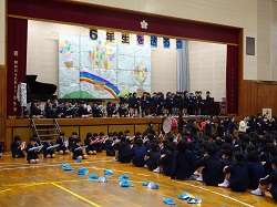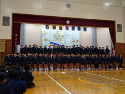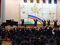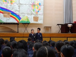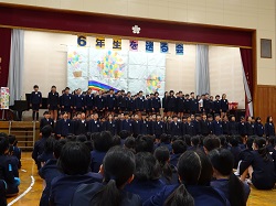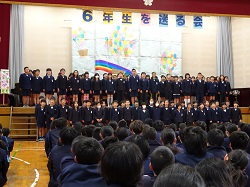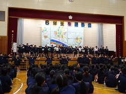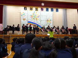 この集会が、全児童が集まる今年度最後の機会です。各学年の趣向を凝らした発表を通して、6年生との別れを惜しみました。