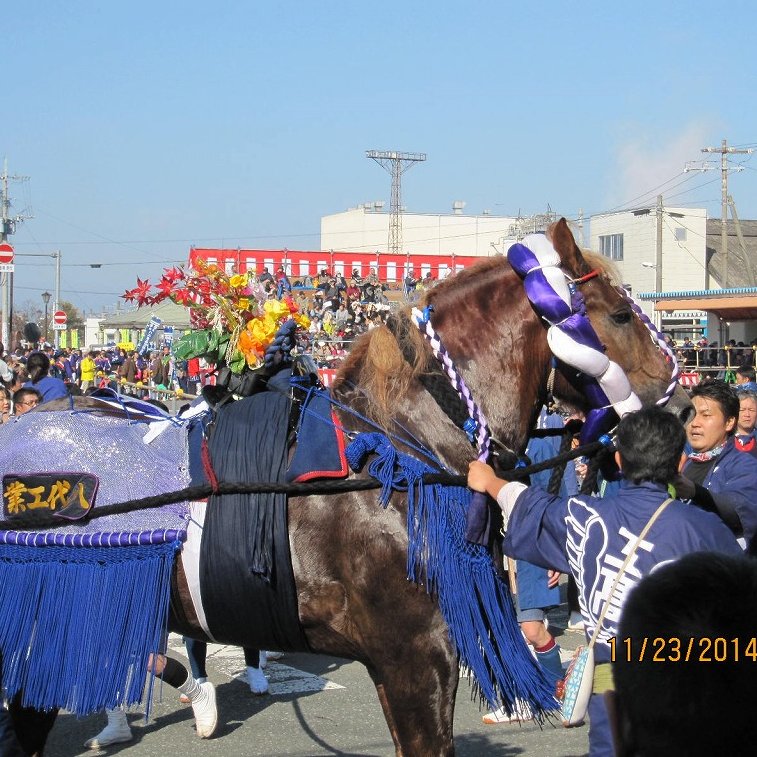 花馬(飾り馬)は高校の同窓会や各種団体から出しています。激しく走り出す馬もいるので、これをコントロールする人たちも大変です。