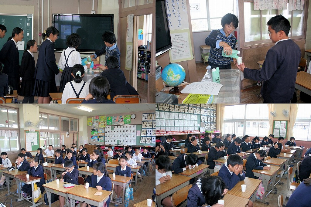 今日は、フッ化物そのものではなく、水で練習をしました。初めてのことなので戸惑っている児童や、笑いだしそうな児童もいましたが、何とか手順は覚えました。