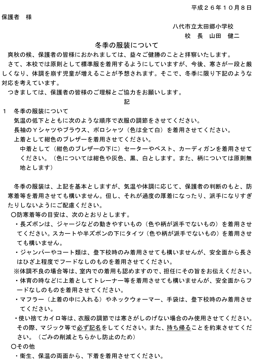 さて、太田郷小学校では、本日下記の文書を配布しました。読んでいただき、お子様の服装についてもご家庭でよく話し合いをお願いいたします。