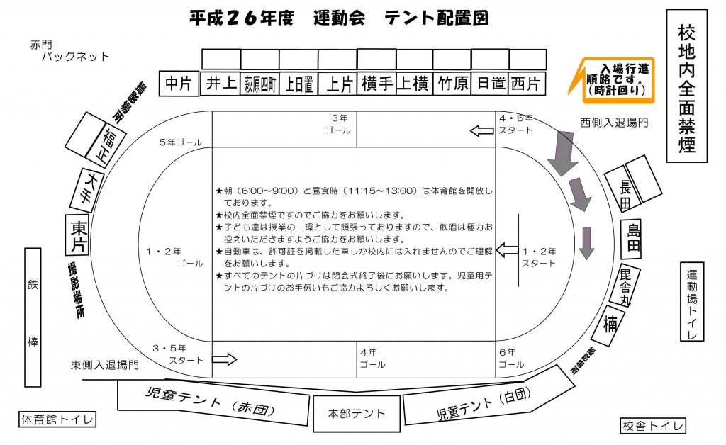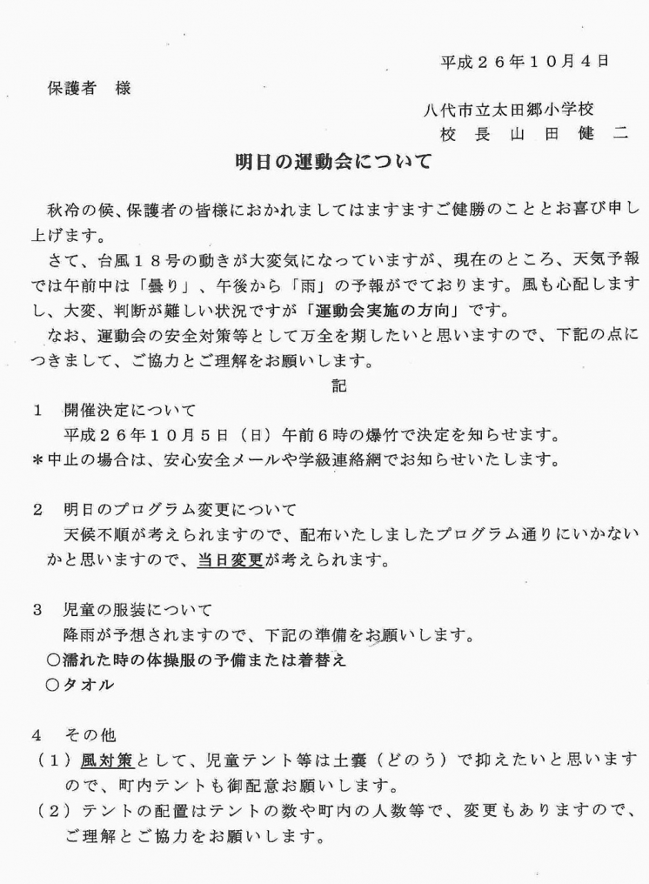 なお、天候による運動会延期の場合の対応につきましては、保護者の方に配付しました「平成26年度運動会の開催について」というプリントでもう一度確認お願いします。