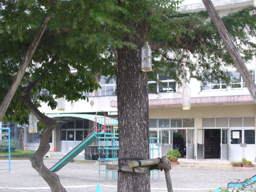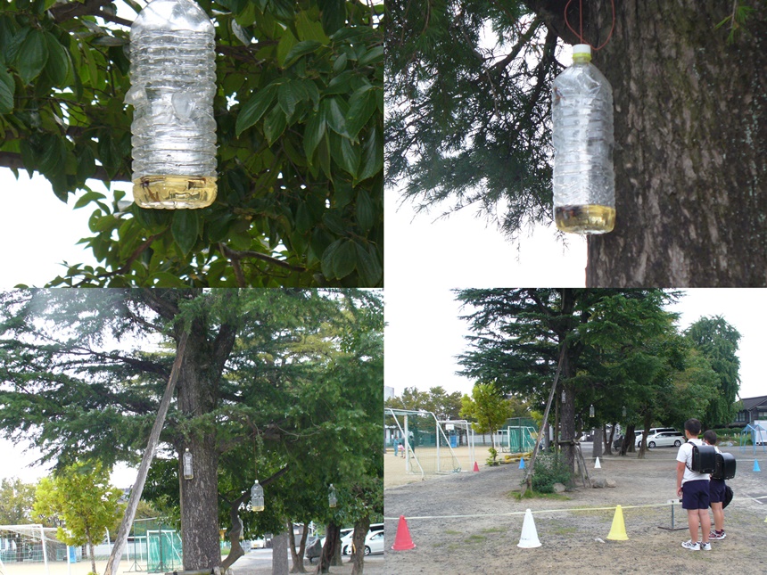 しかし、子どもたちに危害が及ぶといけないので、理科担当の村嶋先生がスズメバチ取り機を手作りして設置してくださいました。