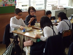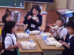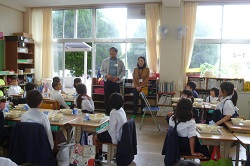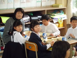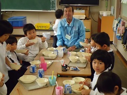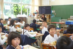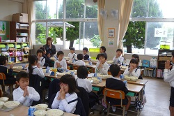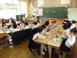 1年生から6年生までのそれぞれの教室に来ていただいて、お喋りをしながら一緒に給食を食べました。