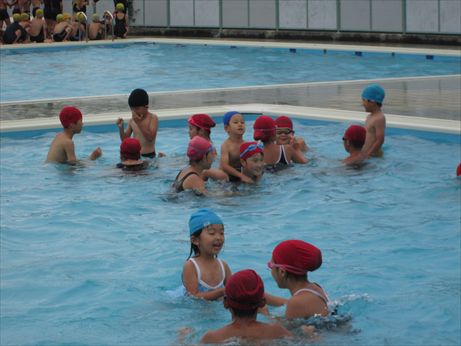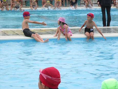 4時間目に小プールでみんなでワイワイプール遊びです。幼稚園の子どもたちにとっては、とっても大きなプールでしたが、5年生が一緒にいてくれて安心して遊べました。