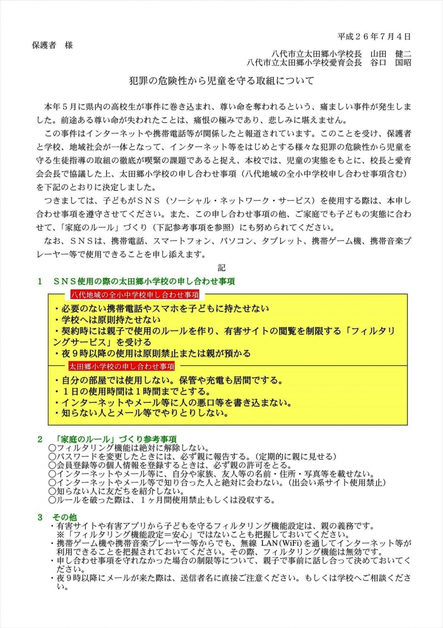 先日お配りしました「犯罪の危険性から児童を守る取り組み」の文書をもう一度お読みいただき、お子さんを守れるのはまず一番に保護者の方であることを強く思っていただければと思います。