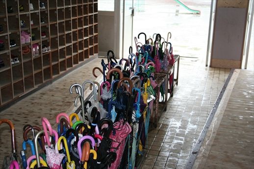 そして、忘れ傘がだんだん増えていきます。学校には、たくさんの忘れ傘が置いたままにしてあります。