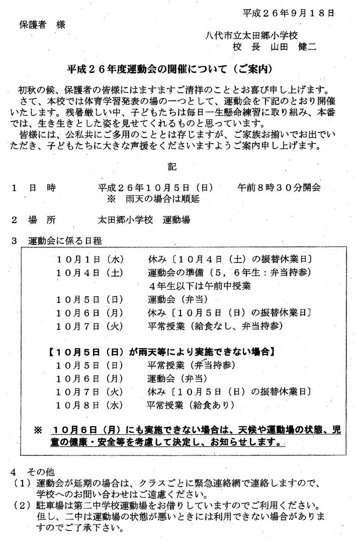 なお、天候による運動会延期の場合の対応につきましては、保護者の方に配付しました「平成26年度運動会の開催について」というプリントでもう一度確認お願いします。