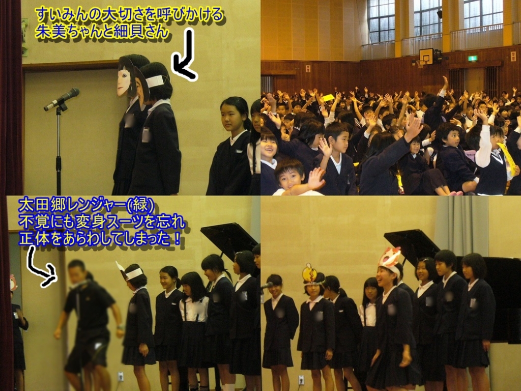 そのあと、一学期の終業式に現れた太田郷レンジャー(緑)が再び現れました。しかし、変身スーツが間に合わなかったようで、今日は、素顔をみんなに見せてしまいしまた。(太田郷レンジャーの姿は公開できないのでフィルターをかけています。)➜この部分は間違いです。正確には妖怪ウォッチの主人公けいた君でした。しかし、フィルターはそのままにしておきます。(^-^)