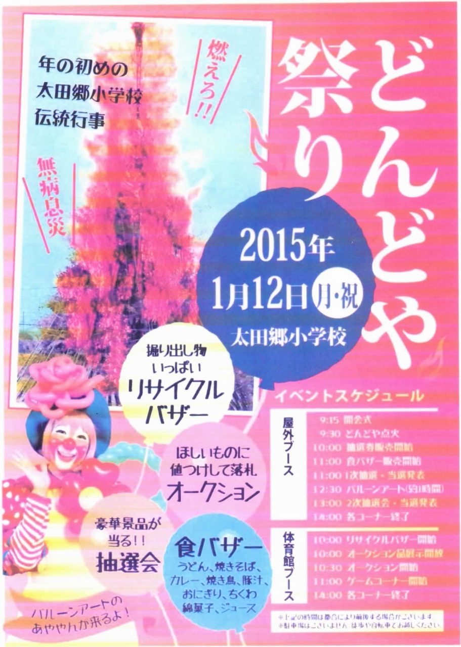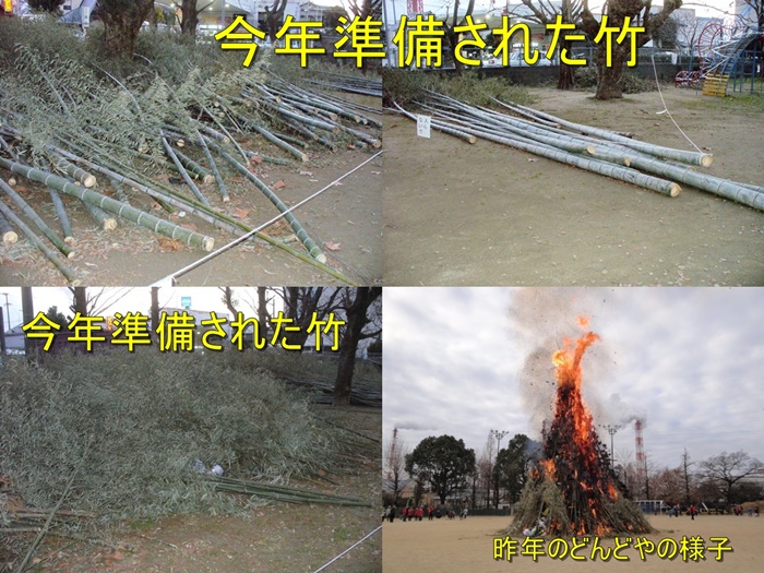 1月14日の夜または1月15日の朝に、刈り取り跡の残る田などに長い竹を3、4本組んで立て、そこにその年飾った門松やしめ縄飾り、書き初めで書いた物を持ち寄って焼く行事です。