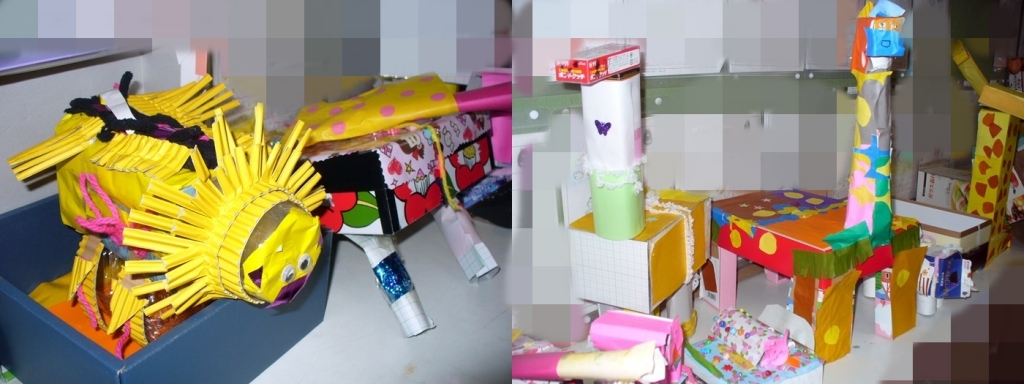 1年生の作品。 身近な材料や箱を使って動物を作りました。何に見えますか?