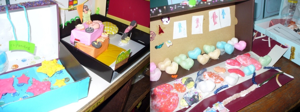 3年生の作品。 すでに紹介した「箱の世界」を自分の創造で作り上げました。どんな不思議な世界が広がっているかな?