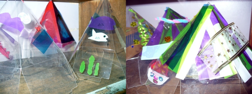 4年生の作品。 透明のプラスチック板にカラーセロファンなどを張り付て、デコレーションをします。
