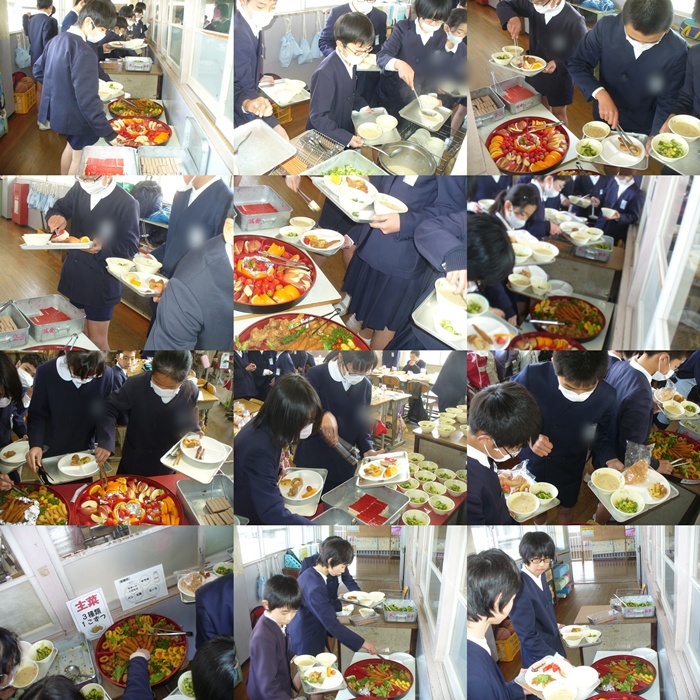今日の六年生の給食は特別でした。卒業のお祝いということで、給食センターの先生方が「バイキング給食」を用意してくださいました。