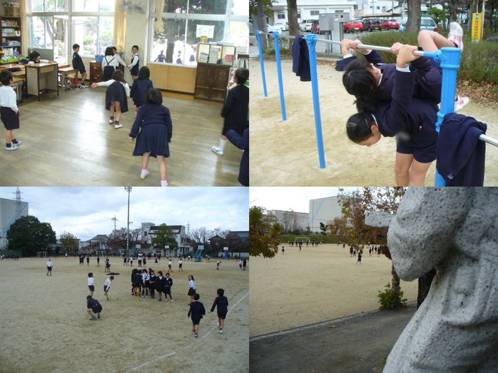 下は、今日の昼休みの様子です。一年生のあるクラスは「だるまさんが転んだ」(先生が審判)。六年生は鉄棒、そのほかにも、おにごっや陣取りなど思い思いに体を動かしていました。