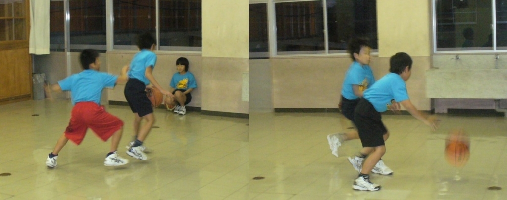 そこで、体育館を上級生が使っている間、基礎トレーニングや基本練習を図工室などを使ってすることがあります。今日もマンツーマンディフェンスの練習をしていました。
