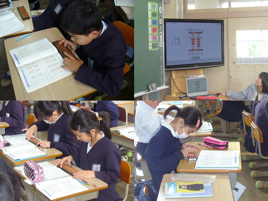 三年生のこの時期に初めてそろばんを扱いますが、ほとんどの子が初めてで興味津々。でも、五玉一玉を入れる手順を覚えるのは大変ですね。
