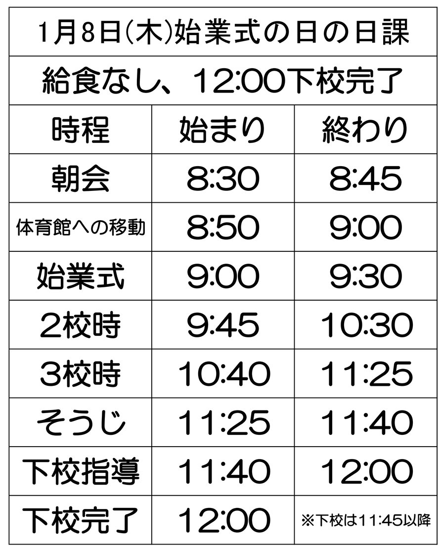 始業式の日課は下の通りです。「給食」はありません。11時45分~12時00分に下校します。