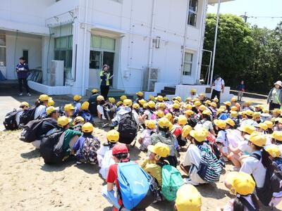 その後に、防災頭巾を被って避難を行いました。子供たちはみんな真剣に無言で避難することができました。
