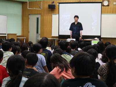 9月9日(火)の3校時に、船津地区の森田義勝さんを招いて乙女の宝集会を開催しました。森田さんは、10年前から船津地区の登下校時のバスの見守りをされています。