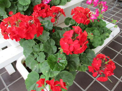 玄関側のプランターに植えてあるのは、入学式で飾ったゼラニウムです。赤、ピンク、白とピンクのグラデーションなど、色鮮やかに花を咲かせています。赤いゼラニウムは「君がいて幸せ」、ピンクのゼラニウムは「決意」が花言葉だそうです。