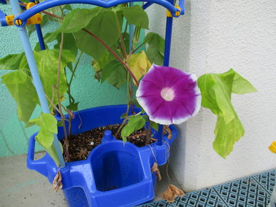 1年生が種から育てていたアサガオが、1つ、2つと咲き始めました。1年生は、毎朝登校すると、まず自分のアサガオの鉢の所に行き、欠かさず水やりをしていました。これからもどんどん花が咲きますよ。