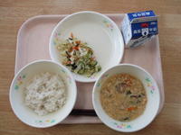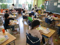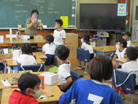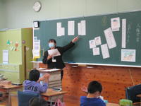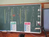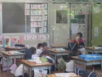 6年生は道徳「カスミと携帯電話」、5年生は算数「少数の倍」、4年生は国語「つなぎことば」、3年生は図工「にじんで広がる色の世界」、2年生は算数「100より大きい数」、1年生は国語「すきなものなあに」、まなび1は日生、まなび2は「体を動かそう」でした。