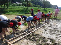 田んぼに足を入れたときは、その感触に「ヒャッ!」と声をあげた子どももいましたが、その後はせっせと苗を植えました。尋ねてみると、おうちの田植えの手伝いや、まつやま塾で田植えをしたことのある子どもが何人もいました。だから、手際よく田植えができたのですね。