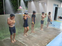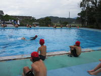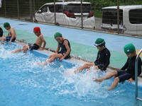 低学年は、諸注意で「はひふへほ」の話を聞いた後、忍者になったり、足をバタバタさせたりして水に慣れていました。中学年も、シャワーを10秒間しっかり浴びて、渦巻きを楽しみました。高学年は、平泳ぎやクロールなどの模範泳法を見て、昨年の自分よりきれいに速く泳げるようになりたいと、早速練習を始めていました。