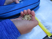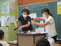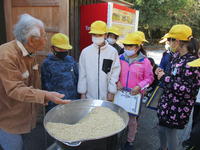 今日は、5年生が、先日脱穀した籾の籾すりを行いました。ゲストティーチャーの宮本さん所蔵の機械を使い、籾を籾殻と玄米にわけていきます。お米が熱をもたないようにゆっくりと籾すりをするのが、おいしいお米にするコツなのだそうです。子ども達は、小一時間かけて籾すりを体験させてもらい、つやつやの玄米にすることができました。籾殻は、田んぼの土に鋤きこんで肥料として使うことができるそうです。一連の米作りを体験することで、普段何気なく食べていたお米を、より味わって食べるようになると思います。
