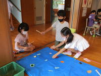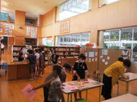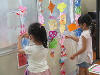 さて、今日は、1年生が何やら廊下の窓付近にペタペタと貼り付けています。尋ねてみると、図工の時間に、色紙を折り曲げて「ちょっきん ぱっ」と切り、飾り付けているところでした。風が吹くとひらひらとなびいて素敵な飾りになっています。七夕を前に、きっと織り姫や彦星も喜んでいると思います。